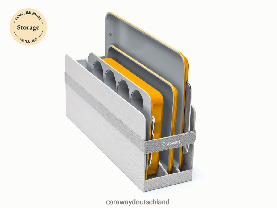 Lernen Sie das 5-teilige Backgeschirrset mit Keramikbeschichtung von Caraway kennen, das frei von giftigen Chemikalien ist. Dieses Set enthält 2 Backbleche, eine Muffinform, eine rechteckige Form und Schrankorganisatoren.